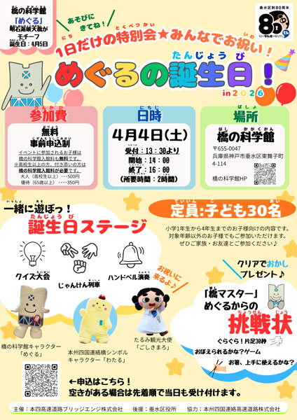 | 料金 | 無料 ※イベントに参加されるお子様はイベント参加費および橋の科学館入館料も無料です。 ※高校生以上の方、付き添いの方については、入館料が必要です。 大人:500円 65歳以上:350円(当日、橋の科学館にてお支払いください) |