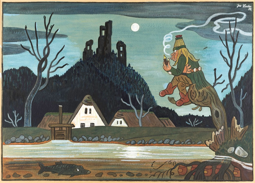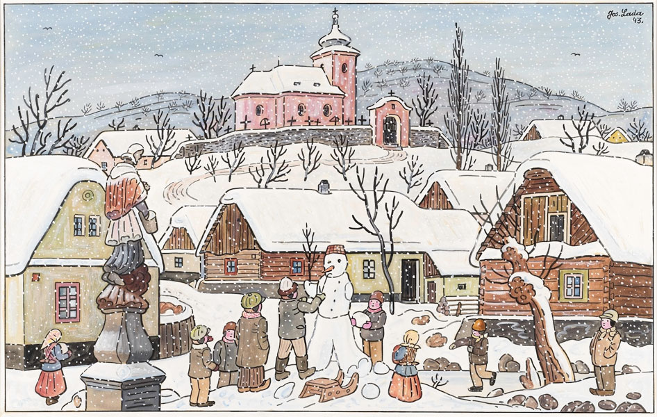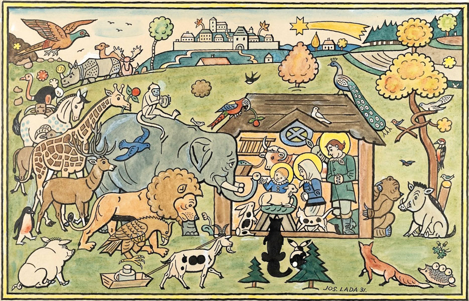 プラハ南東の小さな村フルシツェにて貧しい靴屋の息子として生まれたラダは、幼い頃に右眼を失明しながらも絵をほぼ独学で学び、明瞭な線描と色彩による画風を確立します。やがて新聞雑誌の諷刺画を描くようになり、ヤロスラフ・ハシェクの小説『兵士シュヴェイクの冒険』の挿絵を手がけたことで一躍有名になります。また、我が子のために創作童話をつくったことをきっかけに子どもの本にも取り組み、後年には絵画も制作しました。幼い頃に過ごした農村での思い出をもとに、季節がめぐる自然のなかで暮らす人びとや動物たちの姿を素朴に描いた作品は、チェコをはじめ世界中の人たちを魅了しています。