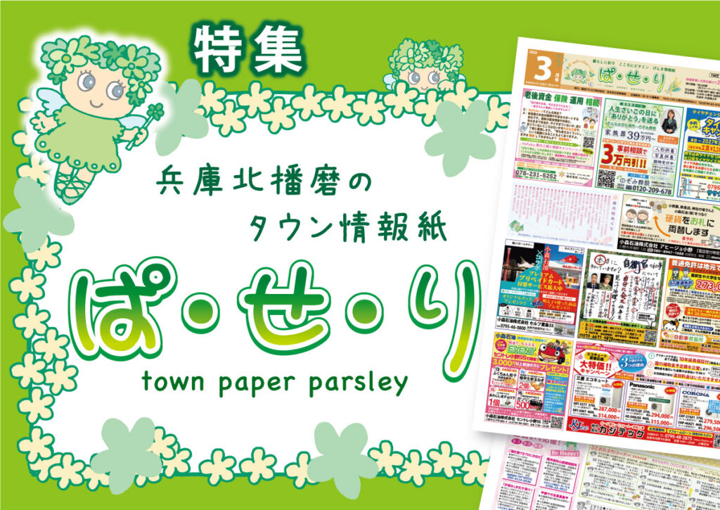 暮らしに彩り・こころにビタミン・げんき情報紙「ぱ・せ・り」毎月1日発行のタウン情報紙「ぱ・せ・り」は、新聞折り込みを中心に、兵庫 北播磨(三木市・小野市・加西市・加東市・西脇市・多可町)の、すてきなお店の紹介や、街の楽しい情報をお届けしています。