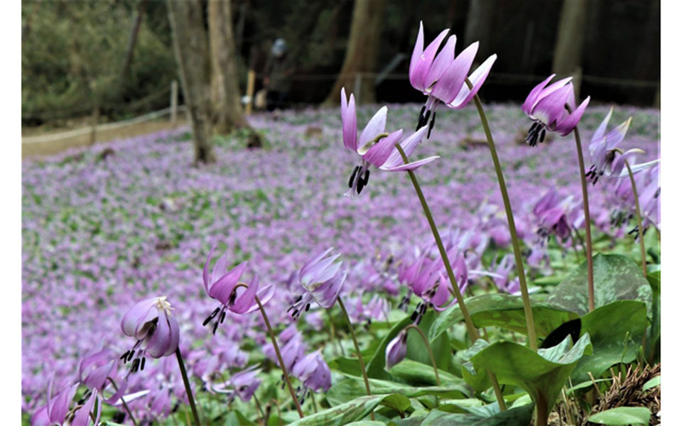 丹波市氷上町清住にある関西最大級のかたくりの花の密集群生地では、例年3月下旬から4月中旬にかけて、かたくりの花が開花します。かたくりの花は、丹波市の花として知られており、ピークとなる4月上旬には、クヌギ林の中で薄紫色の可憐な花が一面に咲き、まるで紫の絨毯を敷き詰めたかのような景観が楽しめます。見頃にあわせて4月の上旬の日曜日には、かたくり祭りも開催され多くの観光客で賑わいます。