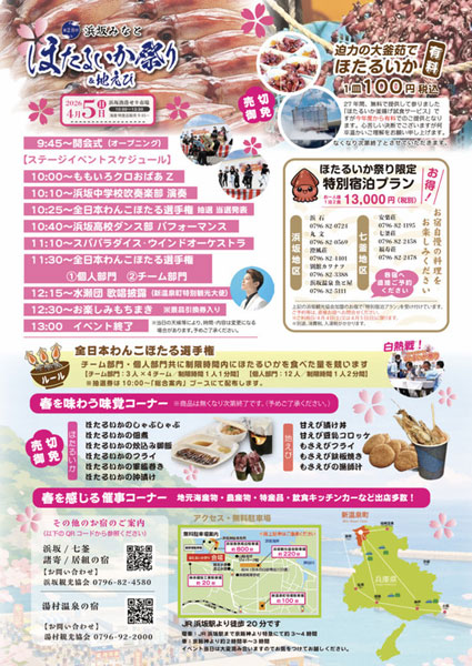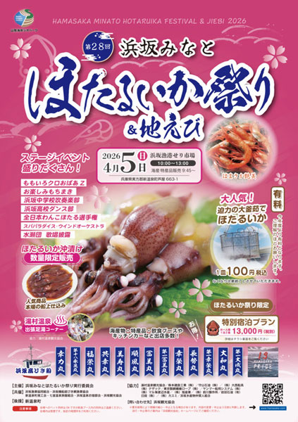 ほたるいか水揚げ量日本トップクラスを誇る新温泉町浜坂で、旬のほたるいかと地えびが味わえる「第28回浜坂みなとほたるいか祭り&地えび」を開催します。会場では、大人気の「大釜茹でほたるいか」・旬のほたるいかや地元でしか食べられない「浜坂地えび」を味わうことができる味覚コーナー、「全日本わんこほたる選手権」、「お楽しみもちまき」などを開催します。ぜひこの機会にお越しください。