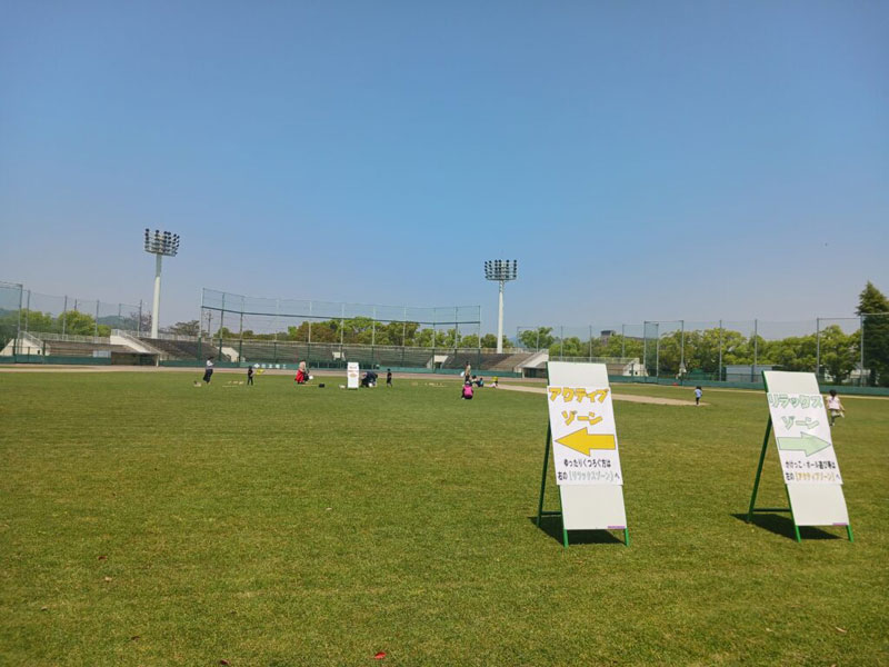 会場となる野球場の芝生エリアは、座ってのんびり過ごすのも、走り回って体を動かすのも自由。レジャーシートを広げてくつろいだり、家族や友人と軽く体を動かしたりと、参加者それぞれのスタイルで楽しめる。遊び道具の持ち込みも可能なので、ボールやフリスビーや縄跳びなど、屋外で遊べるアイテムを持参しよう。モルックが楽しめるスペースもあります。ゆったりと過ごす時間でリフレッシュしよう。
