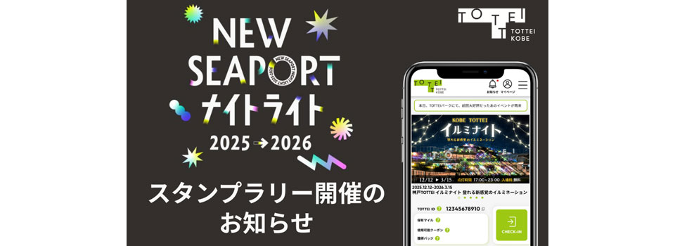 ウォーターフロントエリアにて開催中の「NEW SEAPORT ナイトライト 2025-2026」において、このたび2026年2月20日~3月15日までTOTTEI KOBE公式アプリ上でスタンプラリーを開催いたします!開催期間中3か所でスタンプを獲得した方には先着順でオリジナルグッズをプレゼント!この機会にぜひTOTTEI KOBE公式アプリをダウンロードして、スタンプラリーをお楽しみください!